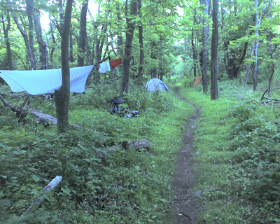 Sunday, 6/7 AT Miles = 18.0 / 951.1 Other Miles = 0.4 / 35.8 Total Miles = 18.4 / 985.9 Today was another easy day, more or less. I was camped with a bunch of people at Pass Mountain Hut including Gator, Slag Line, Couscous, Hulk, and Bookworm. We all decided that we would hike the 7 miles to Elkwallow Wayside in the morning and get both breakfast and lunch there. I usually get up early and am used to tiptoeing around trying to be quiet as most of the other hikers are still sleeping, but this morning most everybody was awake and I was the 2nd one to leave about a quarter to seven. By 9:15 I was at the wayside and ordered a muffin with egg, cheese, and bacon on it. I let that settle for a while, then about 10:30 I decided it was late enough to have the first lunch of the day and I ordered a bacon cheeseburger, fries, and a blackberry milkshake. Yum! A bit before noon I finally tore myself away, shrugged into my backpack and bid farewell to the hikers who were still sitting at the picnic table outside the wayside. I hiked the next ~ 5 1/2 miles to Gravel Springs Hut, where I stopped for my second lunch and to refill my water bottles. This hut is a very short distance from a trailhead parking area on the Skyline Drive, and as I was walking over to the spring to fill my water bottle a couple who had walked down from the parking lot with their dog were letting the dog play in the spring. Yuck! I yelled out "Don't let your dog play in the spring, please!" and they scurried back up the trail without acknowledging me. Gross! Spring water spiced with dog slobber and bacteria. Well, I went back to the shelter and sat for another 10 minutes to let the spring flush itself out and settle a bit, then I went back and filled my water bottle. I treat all of my drinking water, though I wish I had a filter for this fill up! Back at the wayside I had discussed today's planned stopping point with Gator and Slag Line, and we all planned to stop at a spring shown on the map and in the guidebook at Hogwallow Flats. I left Gravel Springs Hut with Gator for the 3 1/2 mile walk to Hogwallow Flats, stopping to take in the view from the top of North Marshall Mountain on the way. Well, we never saw any spring at Hogwallow Flats, and we knew for sure we had missed it when we came to the Skyline Drive crossing north of it. The next sure water was another 6 or so miles away, and while we could have pushed on that far it would have been an unpleasant way to end the day and would also have left us way too close to town this morning. Getting into town at 8:00AM is no good because you can't really check into a motel that early in the morning and that leaves you dirty and smelly and laden with a backpack as you go about town doing your town chores. So, we crossed the road and pushed on up the trail a ways just looking for a spot big enough to set up for the night. We found the spot shown in the picture in the previous post and while Gator and I were setting up for the night Slag Line showed up. He hadn't seen the apparently invisible spring at Hogwallow Flats either. Since we were dry camping I didn't have enough water to take my usual bandanna bath, and I think sleeping is going to be difficult tonight. My body is coated in sticky sweat. I hate that. -- ~~~~~ Monkeywrench Allen F. Freeman allen@allenf.com www.allenf.com allenf.blogspot.com