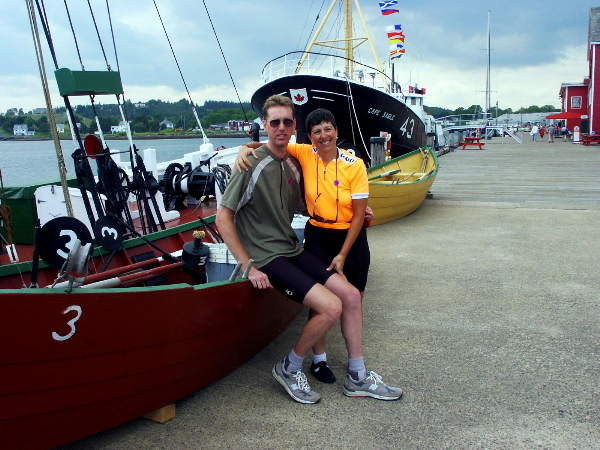 Sunday, July 7: There was a Big Red's (a local chain restaurant) down the road from the campground, but it wasn't open this morning. We had to ride a while to get breakfast in a little roadside restaurant where we met a group of four cyclists doing a sagged tour. The highlights of the day were seeing the towns of Mahone Bay and Lunenburg. We took some time to tour the Fisheries Museum in Lunenburg. We ended yet another 100-kilometer day rather late when we finally reached Rissers Beach Provincial Park.